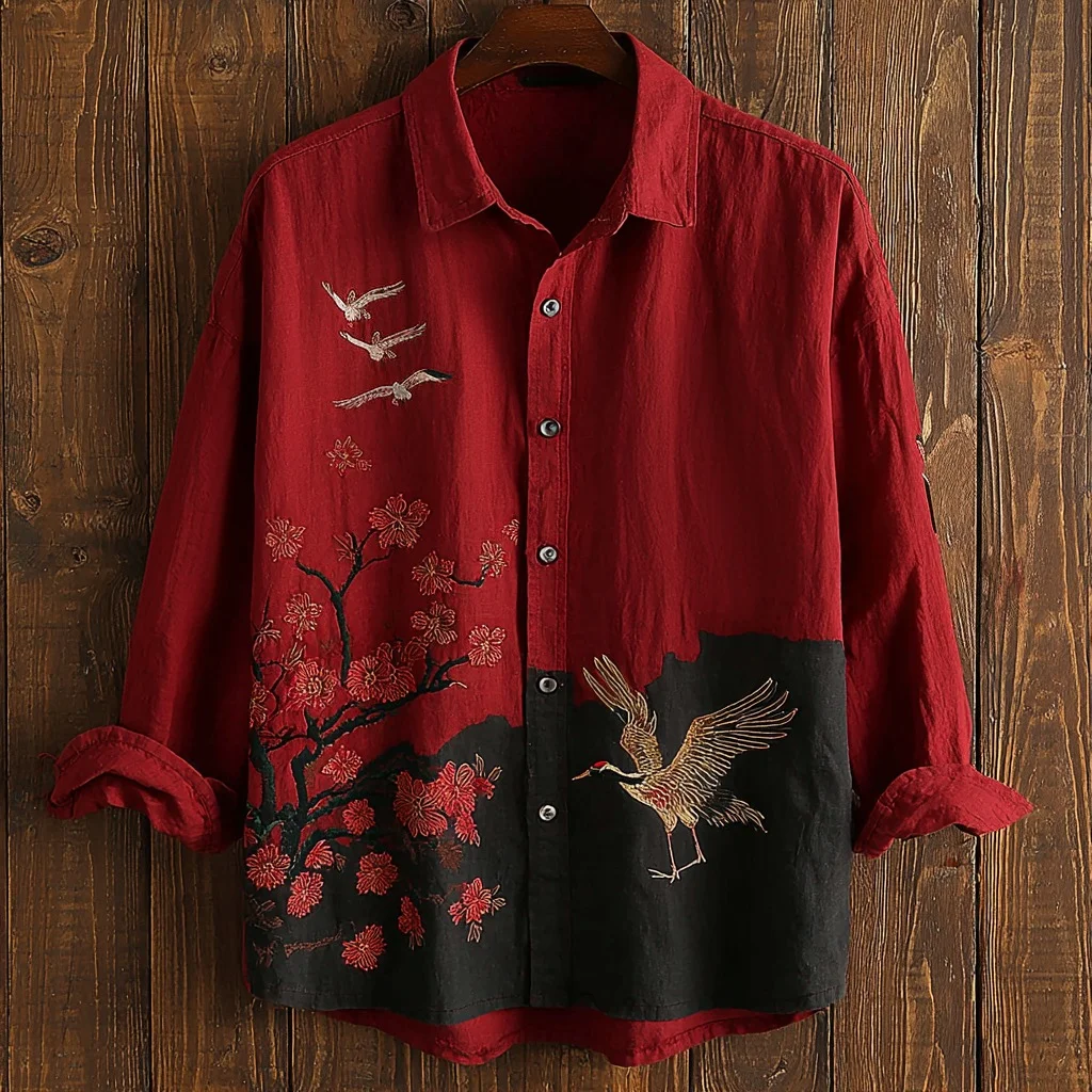 Japanese Cherry Blossom And Crane Art Print Casual Linen Shirt