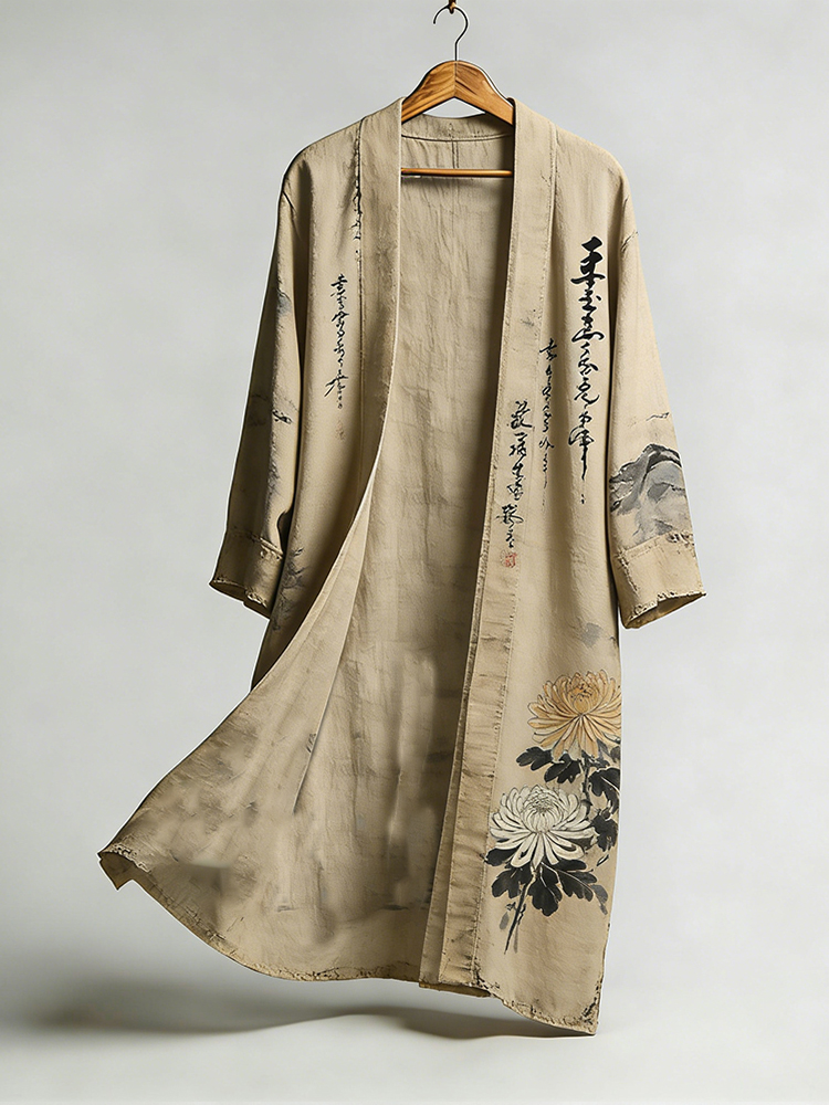 Men's Vintage Chrysanthemum And Grotesque Stone Art Linen Kimono